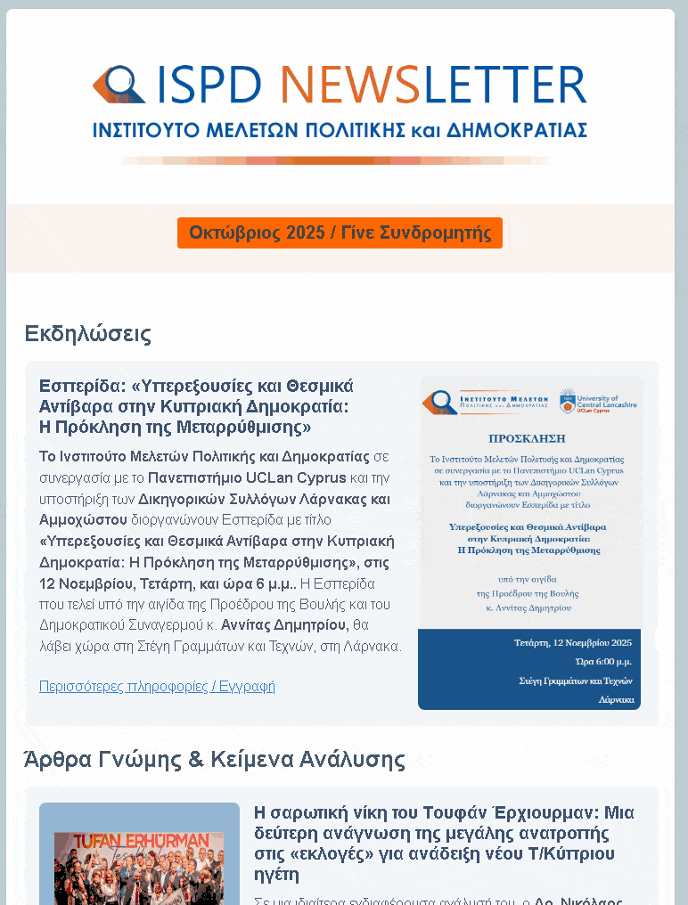 In a particularly interesting analysis, Dr. Nikolaos Stelgias, Senior Analyst at the Institute, interprets Tufan Erhyurman's sweeping victory in the "presidential elections" in the occupied territories as a turning point for the Turkish Cypriot community, reflecting a profound socio-political shift. As he points out, the overthrow of Ersin Tatar was not coincidental, but the product of a triple crisis: the suffocating economic reality, the intense reaction against Ankara's interventionism and the defense of the secular identity of Turkish Cypriots against a conservative, religious model. ...