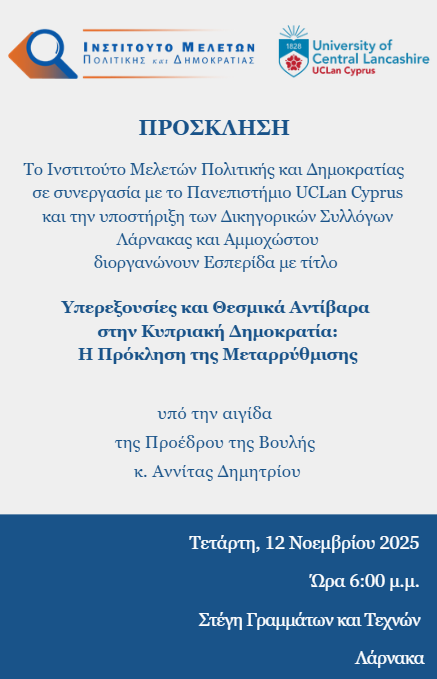 The symposium organized by the Institute of Studies for Politics and Democracy (ISPD), in collaboration with UCLan Cyprus University, will focus on discussing the weaknesses of the existing constitutional framework and the need for institutional reforms, at a time when it is essential to rebuild citizens’ trust in democratic institutions and the rule of law.